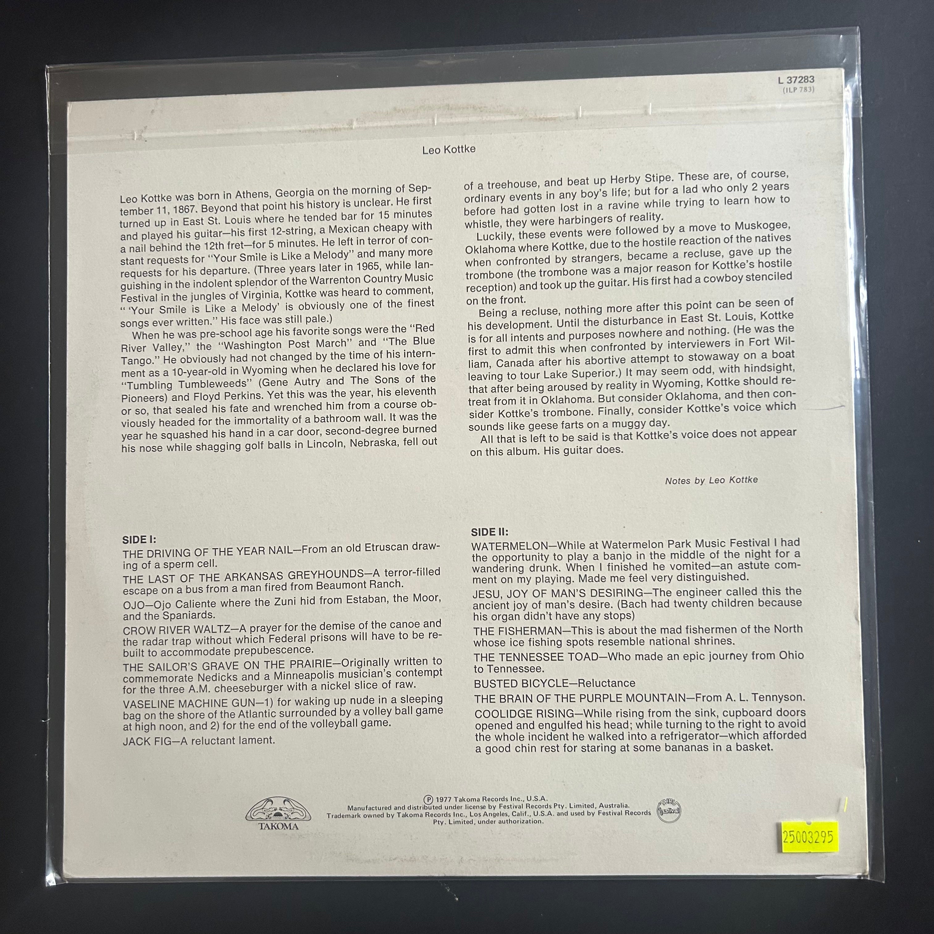 6 & 12 String Guitar by Leo Kottke is a landmark solo instrumental album showcasing his mastery of steel-string acoustic guitar. Released in 1969 on John Fahey’s Takoma Records, this album features intricate fingerpicking on both six- and twelve-string guitars, delivering a rich, nuanced soundscape. Renowned for its distinctive armadillo cover art by Annie Elliott, this record remains Kottke’s most celebrated work, exemplifying his innovative approach and technical prowess in acoustic guitar performance. A seminal release for enthusiasts of fingerstyle guitar and American folk-influenced instrumentals.